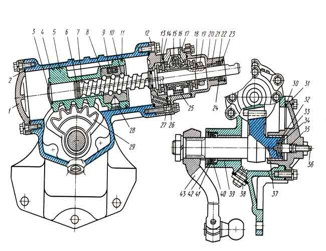 1 – нижня кришка, 2,14,27,31 і 35 – ущільнювальні гумові кільця, 3 – заглушка, 4 – картер рульового механізму, 5 – поршень-рейка, 6 – розрізне кільце, 7 – гвинт рульового механізму, 8 – шрикова гйка, 9 – жолоб, 10 – кулька, 11 – ущільнювальне чавунне розрізне кільце поршня, 12 – проміжна кришка, 21 – голчастий підшипник, 22 і 41 – наполегливі кільця сальника, 23 і 42 – замкові кільця, 24 і 40 – сальники, 25 – реактивна пружина, 26 – настановний гвинт, 29 – сектор, 30 – бічна кришка, 32 – наполеглива шайба, 33 – регулювальна шайба, 34 – стопорне кільце, 36 – регулювальний гвинт, 37 – вал сошки, 38 – зливна пробка з магнітом, 39 – втулка вала сошки, 43 – сошка.